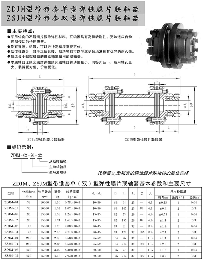 瑞安市寶德隆機(jī)械配件有限公司提供ZDJM型帶錐套單型彈性膜片聯(lián)軸器ZSJM型帶錐套雙型彈性膜片聯(lián)軸器具有拆裝方便,快速安裝等特點(diǎn),廣泛用于連接/固定輪轂孔和零件的軸,例如齒輪,錐齒輪,鏈輪,葉輪,凸輪,皮帶輪和飛輪等軸的聯(lián)結(jié)固定,咨詢電話:18906872378